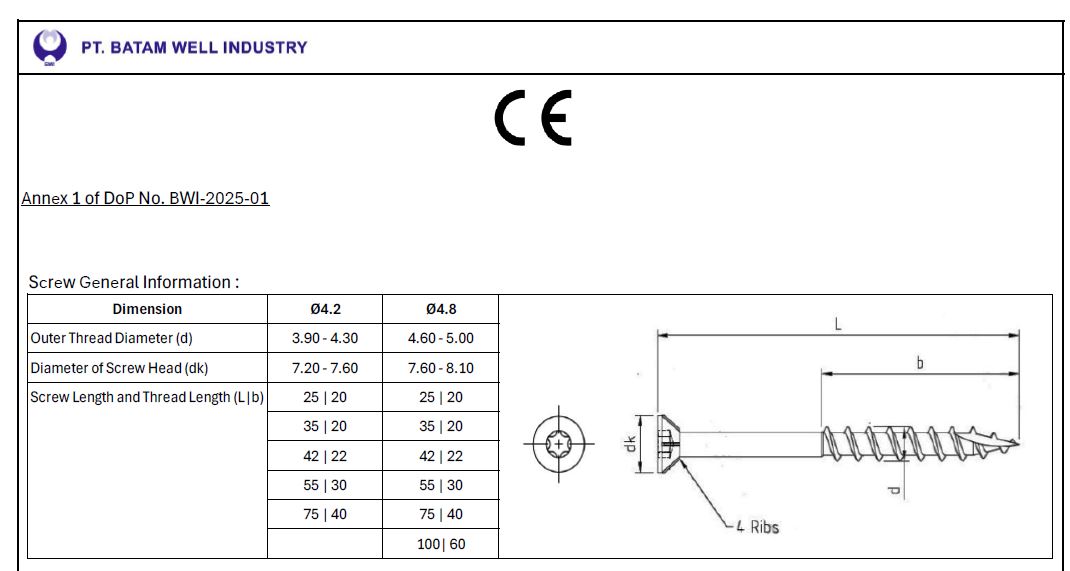 PT Batam Well Industry is committed to delivering reliable fastening solutions through advanced manufacturing and strict quality control. Among our product lines, we provide deck screws in sizes 4.2 mm and 4.8 mm, designed in accordance with international standards to ensure reliability, strength, and consistency. These sizes are produced under stringent quality controls and meet the requirements of CE certification, making them suitable for demanding applications in decking and wood construction. As part of its commitment to excellence, PT. Batam Well Industry continues to enhance product quality, manufacturing efficiency, and customer service to meet the growing needs of global partners. Supporting documentation, including CE certification for deck screws in 4.2 mm and 4.8 mm, is available for reference. DoP BWI-2025-01 Deck Screw